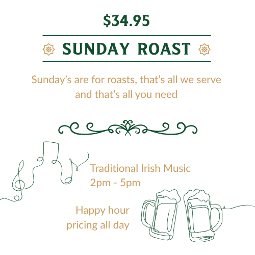 Sundays at Slattery & Sons are all about one thing: a proper Irish Sunday Roast. It is the only menu we serve on Sundays, crafted with care and packed with tradition. Choose from four meats or try the full Roast Board, all served with Yorkshire pudding, crispy roast potatoes, creamy mash, seasonal veg and our signature bottomless Guinness gravy. Paired with live traditional Irish music from 2 to 5pm, it is the perfect way to spend your Sunday in Britomart.