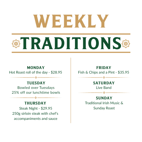 Discover all the weekly specials and traditions that make Slattery and Sons one of Britomart’s favourite spots for great food, drinks and craic. From Happy Hour to Sunday Roast and everything in between, there is something for every day of the week.